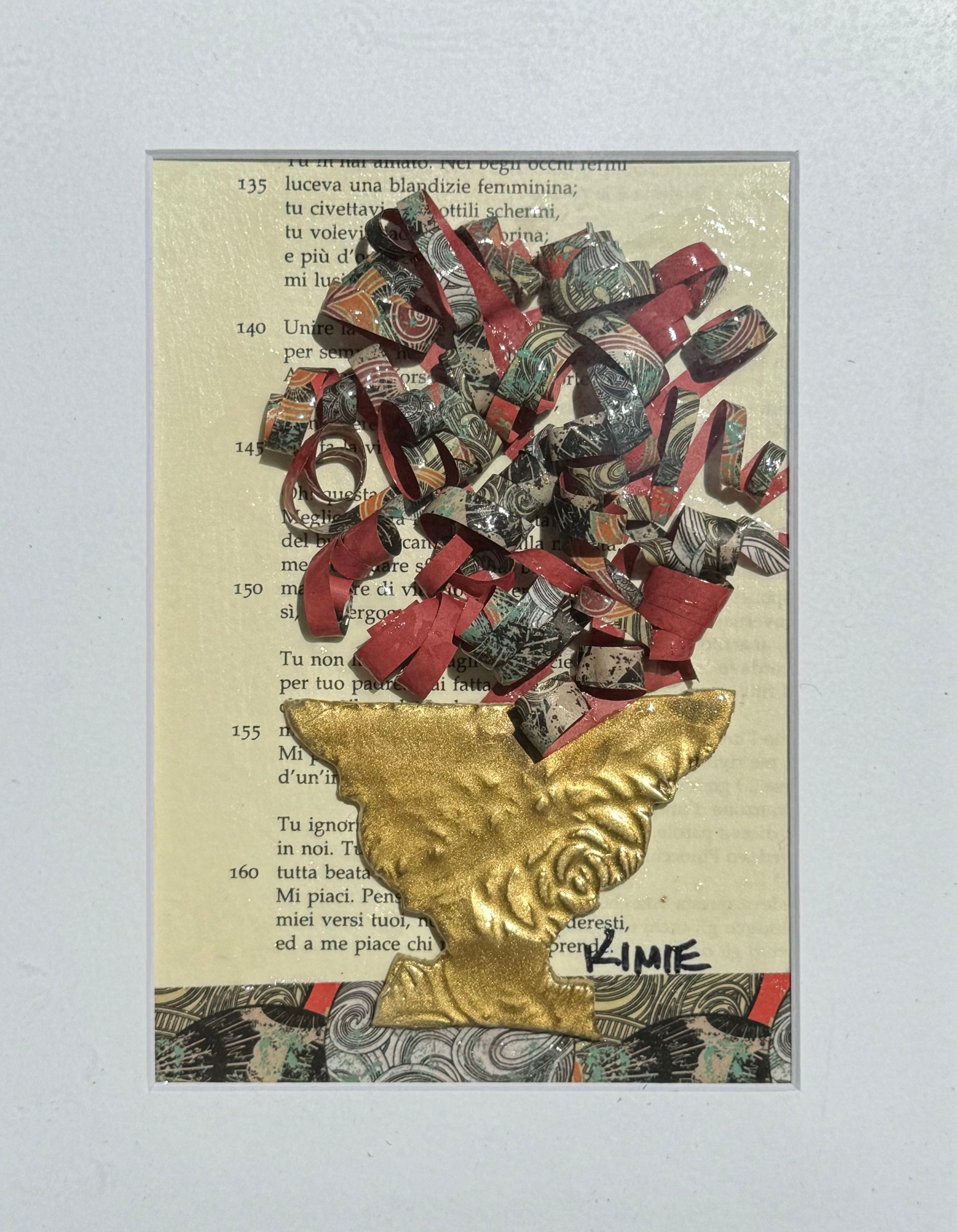 5”x7” mixed media on canvas. Framed and matted in 8”x10” black frame. Kimie Joe creates a delicate balance of nature and craftsmanship in this original mixed media artwork on canvas panel. Handwoven papers crafted into paper petals adorn a handmade ceramic tile vase, creating a fusion of texture and form
