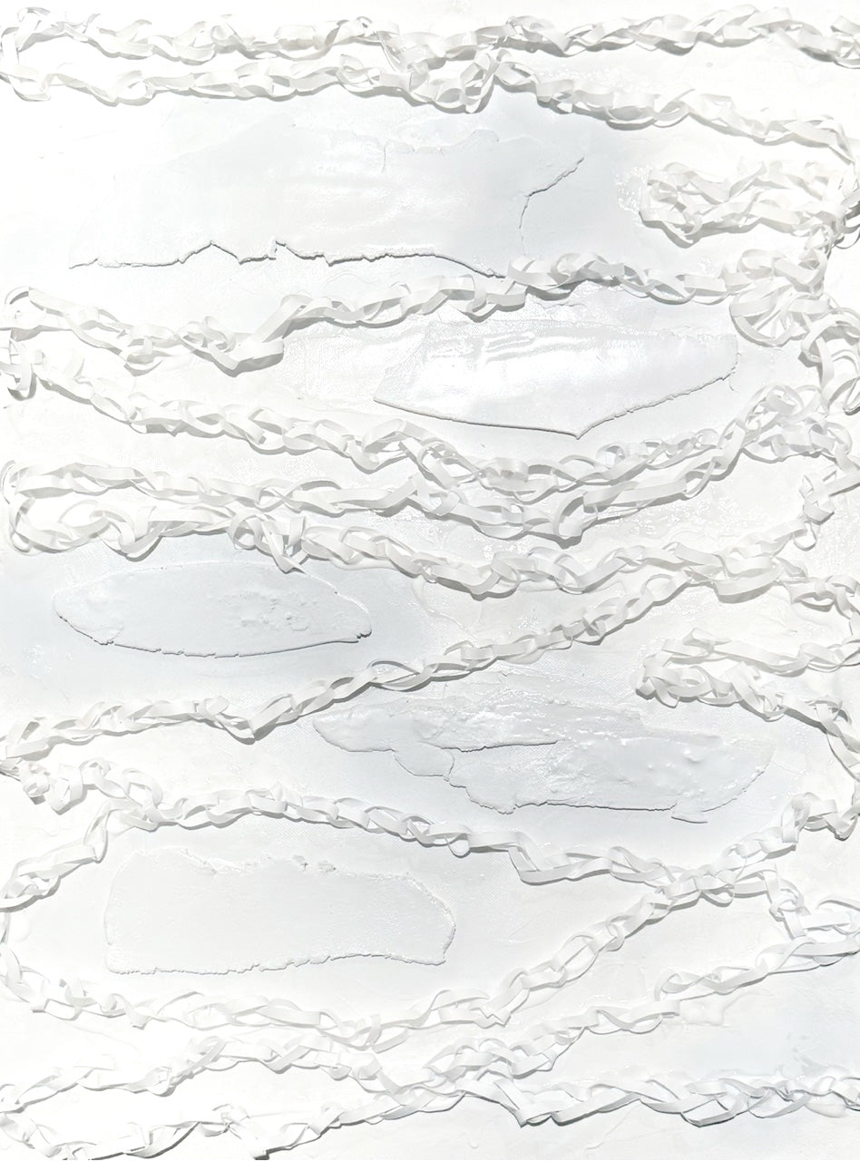 Mixed Media on 18"x24"x1.5" Canvas, unframed. "Lapland" is a mixed media piece blending oil paint, epoxy, woven maps, magazines, and handmade ceramic tiles. Its pure white hues capture the purity and beauty of my Lapland journey, where magical moments with Santa, family, friends, and our children unfolded amidst snowfall and freezing temps.